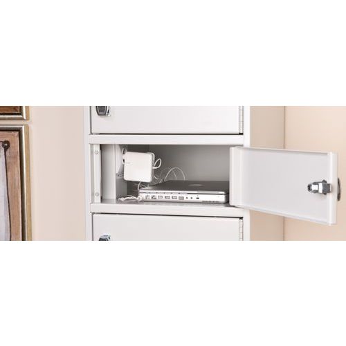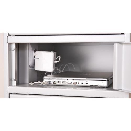 Hyvä ja tilaa säästävä latauskaappi kannettaville ja taulutietokoneille.