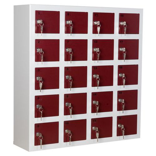| Tavaranimike | Latauskaappi matkapuhelimille, 20 lokeroa, Materiaali: Teräs, Lkm, lokerot/pylväs: 20, Leveys: 750 mm |