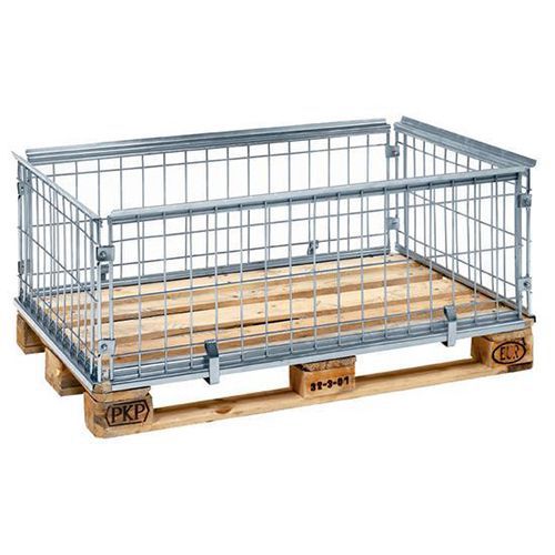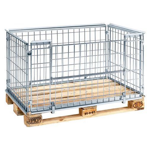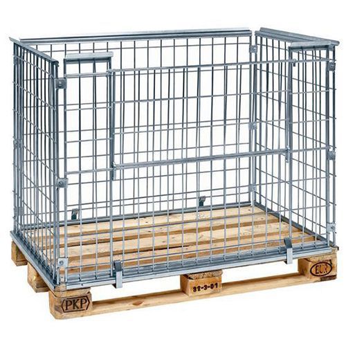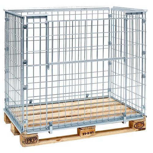 4 sähkösinkittyä mallia: Asennettaan EUR-lavoille, 1200 x 800 mm. Verkon silmät 65 x 120 mm. Pitkällä sivulla on puoliksi taittuva lastausaukko (180040 ilman aukkoa). Pinottava, enintään neljä yksikköä päällekkäin. Enimmäiskuormitus 800 kg/yksikkö. Lavakehikot voidaan pinota ilman lisätarvikkeita. Toimitetaan osina.