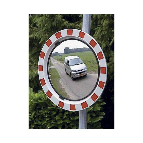 - Puna-valkokehyksinen liikennepeili esim. risteysten ja ulosajoväylien valvontaan. Mukana kiinnityshelat 48-90 mm:n putkiasennusta varten. Polykarbonaatti on akryyliä kestävämpää, ja sitä suositellaan käytettäväksi vaativissa ulko-olosuhteissa. Heijastava kehys lisää liikenneturvallisuutta.