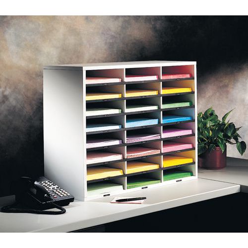 | Tavaranimike | Lajitteluhylly, 24 lokeroa, harmaa, Materiaali: Lastulevy, Väri: Vaaleanharmaa, Kokonaisleveys: 73.7 cm |