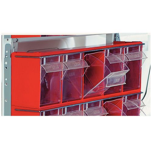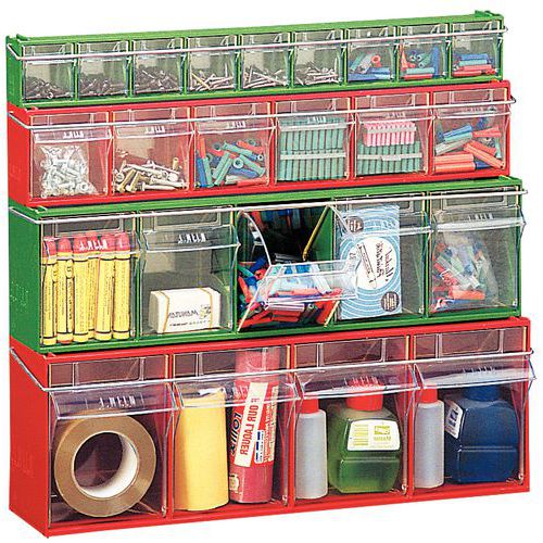 Pinottavat laatikostot. Täydellinen pienten osien säilytykseen. Läpinäkyvät, irrotettavat ja kallistettavat laatikot. Laatikkomoduulit on helppo yhdistää klipseillä. Tilaa erillinen turvalukko, joka estää laatikoita liikkumasta.