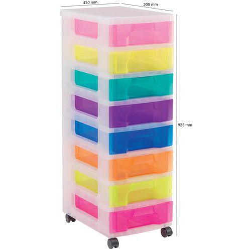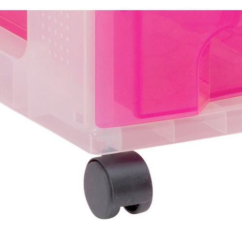 Helposti käsiteltävä 4 pyörällä varustettu laatikosto. Läpinäkyvät laatikot mahdollistavat sisällön näkemisen ja tiivis rakenne suojaa pölyltä. Helmenvalkoiset sivut helppoa merkintää varten. Valmistettu Isossa-Britanniassa