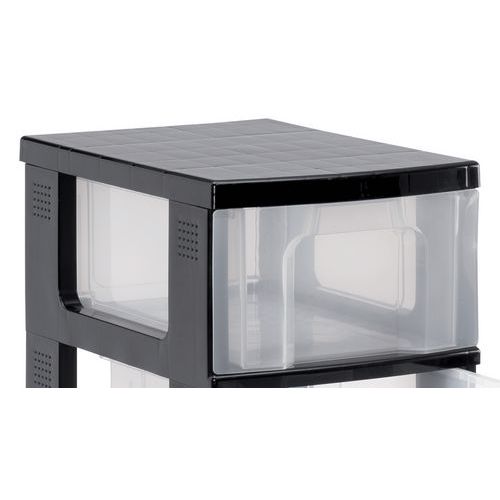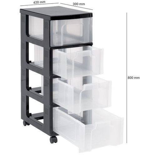 Helposti käsiteltävä 4 pyörällä varustettu laatikosto. Läpinäkyvät laatikot mahdollistavat sisällön näkemisen ja tiivis rakenne suojaa pölyltä. Helmenvalkoiset sivut helppoa merkintää varten.