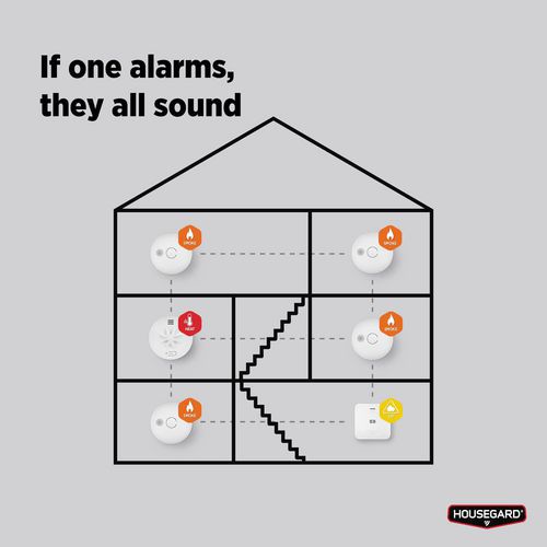- Housegard Luma on langaton, sarjaan kytkettävä palovaroitin, jossa on optinen tunnistuskammio.