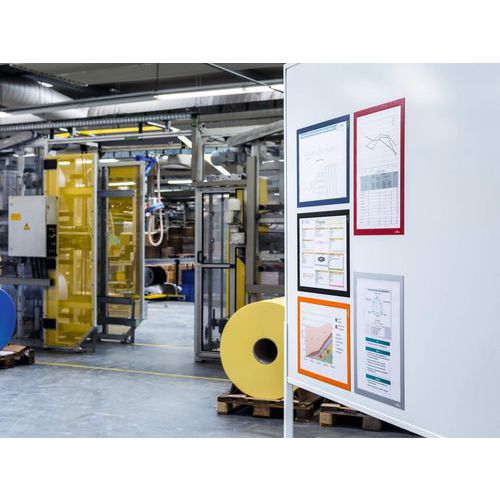 Durablen DURAFRAME® Magnetic A4 on ammattimainen ja joustava ratkaisu A4-kokoisten asiakirjojen esittämiseen magneettisilla pinnoilla. Se kiinnittyy helposti esimerkiksi valkotauluihin, ilmoitustauluihin, kaappeihin, Lean-kuutioihin sekä koneisiin teollisuus- ja tuotantoympäristöissä. Käytännöllinen tapa esittää konedokumentaatiota, käyttöohjeita ja henkilöstötietoa selkeästi ja helposti saatavilla olevalla tavalla. Kehystä voidaan käyttää sekä pysty- että vaaka-asennossa, mikä tarjoaa joustavuutta asiakirjan sisällön ja sijoittelun mukaan. Magneettinen tausta – helppo kiinnittää, siirtää ja käyttää uudelleen ilman jälkiä. Ulkomitat: 236 x 323 mm. Valmistettu EU:ssa