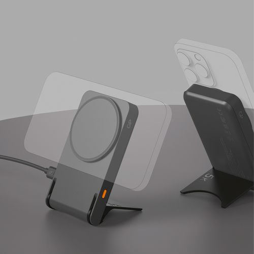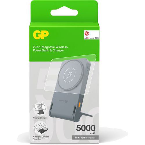 - GP Magnetic Safe on kompaktin kokoinen 2-in-1-varavirtalähde, jossa on langaton lataus ja taitettava teline.