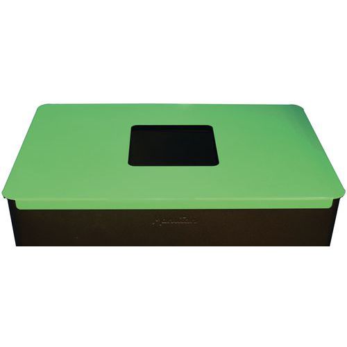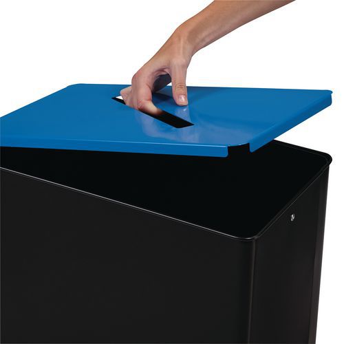 Kierrätysastia, jossa on irrotettava kansi. Värit ja kalibroitu avautuminen helpottavat lajittelua. Jäteastia yhdistetyillä kiinnikkeillä, joilla pussi pysyy paikallaan. Pussit on helppo asettaa ja poistaa.