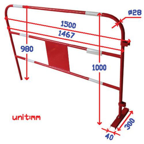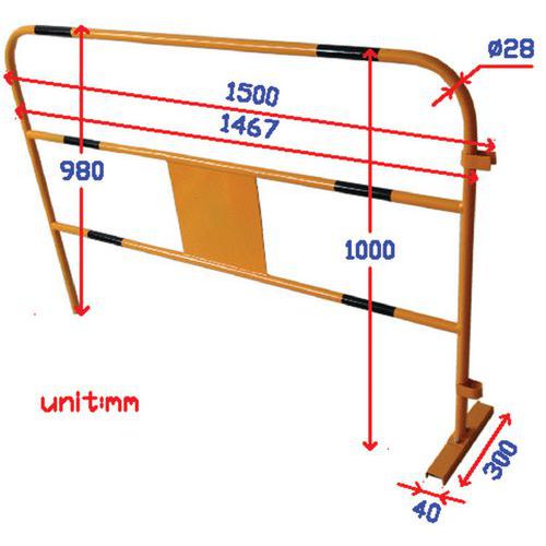 Rakennusrajausaita, jossa on päällehitsatut peltilevyt. Kääntyvä jalka helpottaa koneiden kulkua. Mukana 6 itsekiinnittyvää, heijastamatonta nauhaa. Keskilevyn mitat: pituus 300 mm, leveys 295 mm, paksuus 2,0 mm.