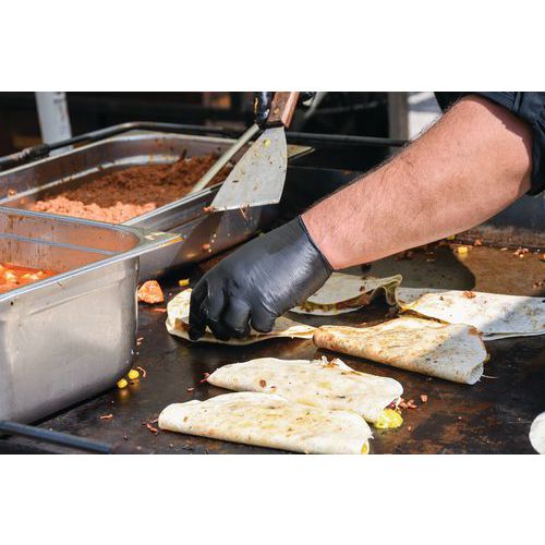 Mustat puuterittomat lateksikäsineet suojaavat kemikaaleilta ja nesteiltä. Täysin liimattu, vaahtoamaton koostumus takaa tukevan otteen märkiä esineitä käsiteltäessä. Vähentynyt ihoärsytyksen tai allergian riski. Ei-vaahdotettu muotoilu helpottaa esineiden käsittelyä kosteissa ympäristöissä. Täysin kuvioitu pinta tarjoaa varman otteen. Hyväksytty elintarvikekäyttöön: Sopii myös moniin elintarviketeollisuuden sovelluksiin.