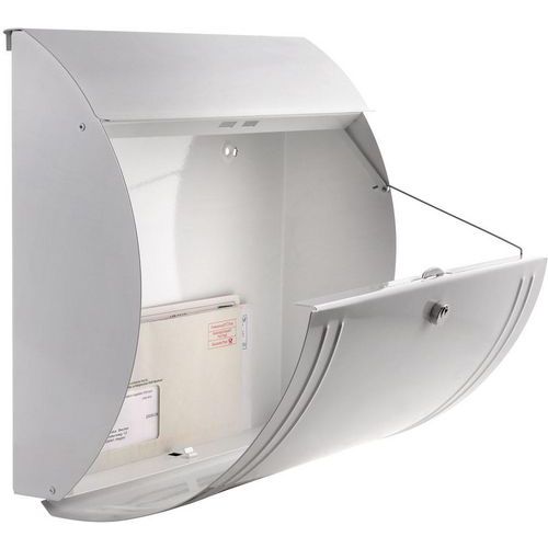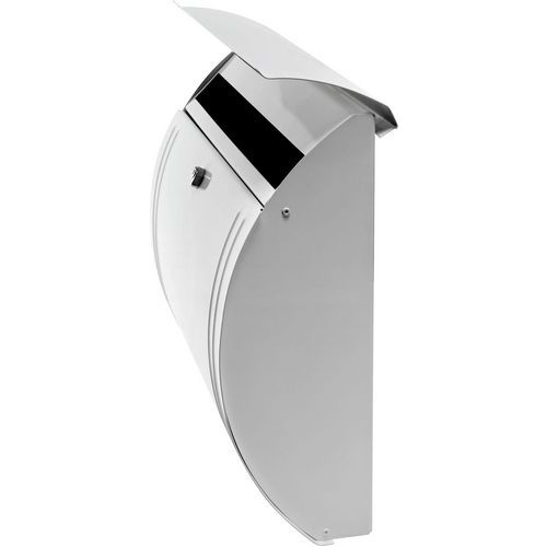 - Yksinkertainen, tyylikäs galvanoidusta teräksestä valmistettu kirjelaatikko, jossa on läpän alla aukko (sisääntulo: 32,5 x 3,3 cm).