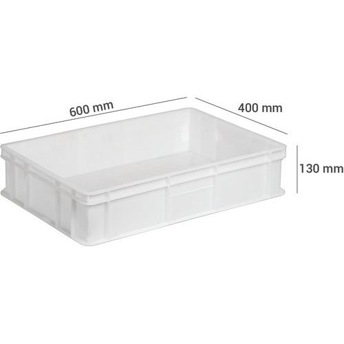 | Tavaranimike | Muovilaatikko EU valkoinen, Tilavuus: 24 L, Pinottava: kyllä, Kokonaiskorkeus: 130 mm, Kokonaisleveys: 400 mm |