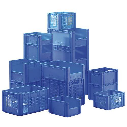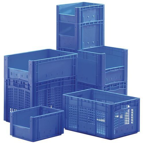 Eurooppalaisen standardin mukainen laatikko, jossa kokonaiset seinät ja tasainen pohja, joka voidaan pinota muiden eurooppalaisen standardin mukaisten laatikoiden ja lavojen kanssa. Kestää öljyjä, rasvoja, happoja ja emäksiä. Vahvistetut reunat tekevät siitä erittäin vakaan pinottaessa. Helppo täyttää ja helppo päästä käsiksi sisältöön. Avoimet ergonomiset kahvat helpottavat kuljetusta. Etiketinpidike sisällön tunnistamiseen. Sileät seinät helpottavat puhdistusta.