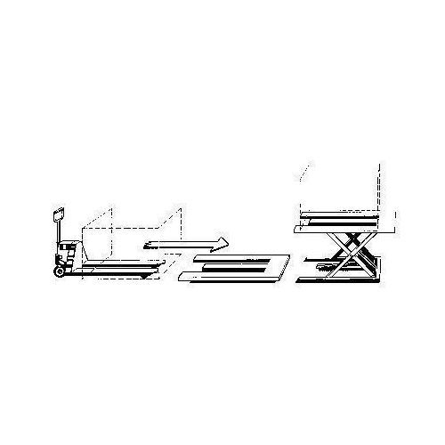 E-muodon kolme jalkaa tukevat lavaa ja mahdollistavat käsilavavaunun ajamisen nostopöydän sisään lavan laskemiseksi tai nostamiseksi.