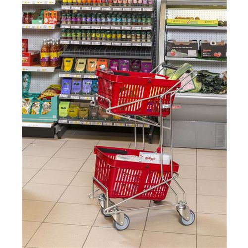 | Tavaranimike | Ostoskorivaunu, Pyörä, Ø: 100 mm, Kapasiteetti: 60 kg, Kokonaiskorkeus: 975 mm, Kokonaisleveys: 260 mm |