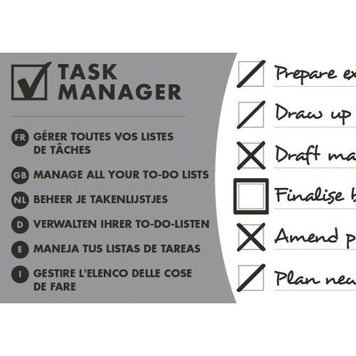 | Tavaranimike | Muistilehtiö Task Manager viivoitettu, Paino: 90 g/m², Viivoitus: Linjat, Sivujen lkm: 140 |