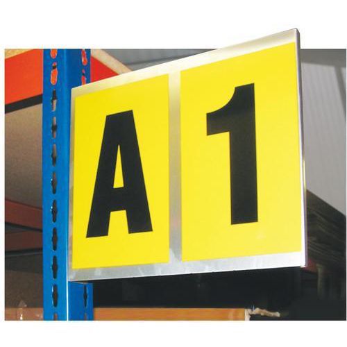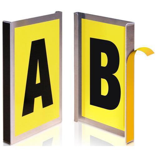 Päätykilpi, jossa teippi tai magneettikiinnitys. Tarramerkit tilataan erikseen, Til.nro 51195-x, luvut 0-9 ja kirjaimet A-Z. Valmistettu Isossa-Britanniassa