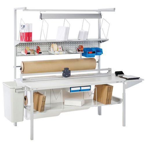 Tämä pakkauspöytä on suunniteltu ergonomiaa ajatellen: kaikki pakkausmateriaalit ovat käden ulottuvilla.
