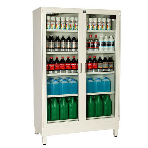 - Tilavuudeltaan paras paloeristetty kaappimme syttyvien nesteiden säilyttämiseen lain vaatimalla tavalla. Hyväksyttynoin 386 yhden litran vetoisen PET-pullon, neljäntoista 25 litran vetoisen kanisterin säilyttämiseen. Kaapin siirtäminen tapahtuu helposti haarukkavaunulla. Lasiovien ansiosta tuotteet näkyvät myymälässä. Oviaukon mitat 1540 x (500 x 2) mm.