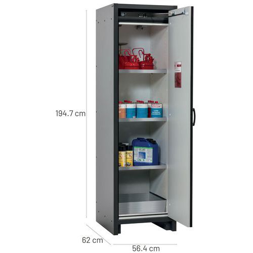 Paloturvakaappi Q-CLASSIC-30. Hyväksytty syttyvien vaarallisten aineiden varastointiin työtiloissa. Toiminta - rakenne. Vankka rakenne ja pitkäikäisyys: kolminkertaisesti saranoitu ovi, kaapin runko valmistettu melamiinihartsista ja tulenkestävistä erikoislevyistä, turvaelementit kootaan varastolokeron ulkopuolella, mikä lisää suojaa syöpymiseltä, ovet metalliedustalla sekä naarmuuntumis- ja iskuvarmalla pinnalla, helppo puhdistaa. Helppo ja mukava käsitellä: ovi pysähtyy mihin tahansa asentoonn, sulkeutuvat itsestään tulipalon sattuessa. Ei valtuuttamatonta käyttöä: ovi lukittavissa profiilisylinterilukolla (integrointi olemassa olevaan lukitusjärjestelmään mahdollista). Helppo kuljetus: integroitu kuljetusjalusta ja irrotettava, valinnainen suojus tai säädettävä tuki jalustan suojuksella. Tuuletus: integroidut ilmaputket, valmiit liitettäväksi (DN 75) tekniseen ilmanpoistojärjestelmään. Valmistettu Saksassa Maks kuormitus (kg) : 600 kg