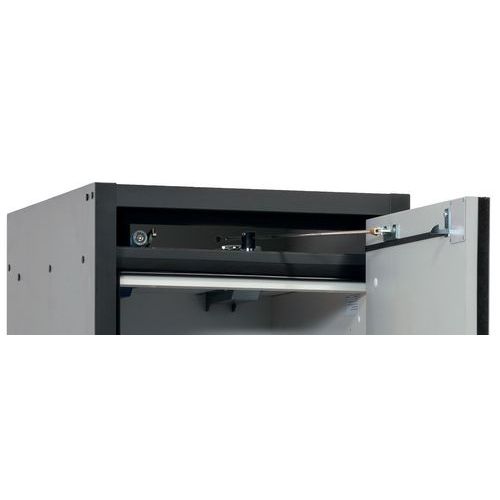 Paloturvakaappi Q-CLASSIC-30. Hyväksytty syttyvien vaarallisten aineiden varastointiin työtiloissa. Toiminta - rakenne. Vankka rakenne ja pitkäikäisyys: kolminkertaisesti saranoitu ovi, kaapin runko valmistettu melamiinihartsista ja tulenkestävistä erikoislevyistä, turvaelementit kootaan varastolokeron ulkopuolella, mikä lisää suojaa syöpymiseltä, ovet metalliedustalla sekä naarmuuntumis- ja iskuvarmalla pinnalla, helppo puhdistaa. Helppo ja mukava käsitellä: ovi pysähtyy mihin tahansa asentoonn, sulkeutuvat itsestään tulipalon sattuessa. Ei valtuuttamatonta käyttöä: ovi lukittavissa profiilisylinterilukolla (integrointi olemassa olevaan lukitusjärjestelmään mahdollista). Helppo kuljetus: integroitu kuljetusjalusta ja irrotettava, valinnainen suojus tai säädettävä tuki jalustan suojuksella. Tuuletus: integroidut ilmaputket, valmiit liitettäväksi (DN 75) tekniseen ilmanpoistojärjestelmään.