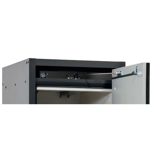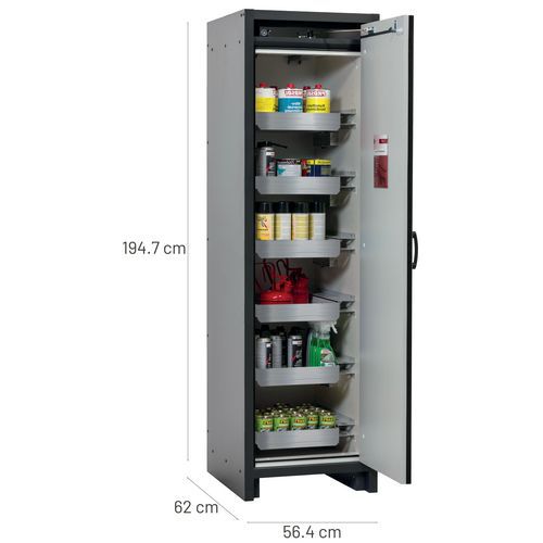 Paloturvakaappi Q-CLASSIC-30. Hyväksytty syttyvien vaarallisten aineiden varastointiin työtiloissa. Toiminta - rakenne. Vankka rakenne ja pitkäikäisyys: kolminkertaisesti saranoitu ovi, kaapin runko valmistettu melamiinihartsista ja tulenkestävistä erikoislevyistä, turvaelementit kootaan varastolokeron ulkopuolella, mikä lisää suojaa syöpymiseltä, ovet metalliedustalla sekä naarmuuntumis- ja iskuvarmalla pinnalla, helppo puhdistaa. Helppo ja mukava käsitellä: ovi pysähtyy mihin tahansa asentoonn, sulkeutuvat itsestään tulipalon sattuessa. Ei valtuuttamatonta käyttöä: ovi lukittavissa profiilisylinterilukolla (integrointi olemassa olevaan lukitusjärjestelmään mahdollista). Helppo kuljetus: integroitu kuljetusjalusta ja irrotettava, valinnainen suojus tai säädettävä tuki jalustan suojuksella. Tuuletus: integroidut ilmaputket, valmiit liitettäväksi (DN 75) tekniseen ilmanpoistojärjestelmään.