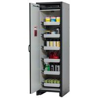 Paloturvakaappi Q-CLASSIC-30. Hyväksytty syttyvien vaarallisten aineiden varastointiin työtiloissa. Toiminta - rakenne. Vankka rakenne ja pitkäikäisyys: kolminkertaisesti saranoitu ovi, kaapin runko valmistettu melamiinihartsista ja tulenkestävistä erikoislevyistä, turvaelementit kootaan varastolokeron ulkopuolella, mikä lisää suojaa syöpymiseltä, ovet metalliedustalla sekä naarmuuntumis- ja iskuvarmalla pinnalla, helppo puhdistaa. Helppo ja mukava käsitellä: ovi pysähtyy mihin tahansa asentoonn, sulkeutuvat itsestään tulipalon sattuessa. Ei valtuuttamatonta käyttöä: ovi lukittavissa profiilisylinterilukolla (integrointi olemassa olevaan lukitusjärjestelmään mahdollista). Helppo kuljetus: integroitu kuljetusjalusta ja irrotettava, valinnainen suojus tai säädettävä tuki jalustan suojuksella. Tuuletus: integroidut ilmaputket, valmiit liitettäväksi (DN 75) tekniseen ilmanpoistojärjestelmään. Valmistettu Saksassa Maks kuormitus (kg) : 600