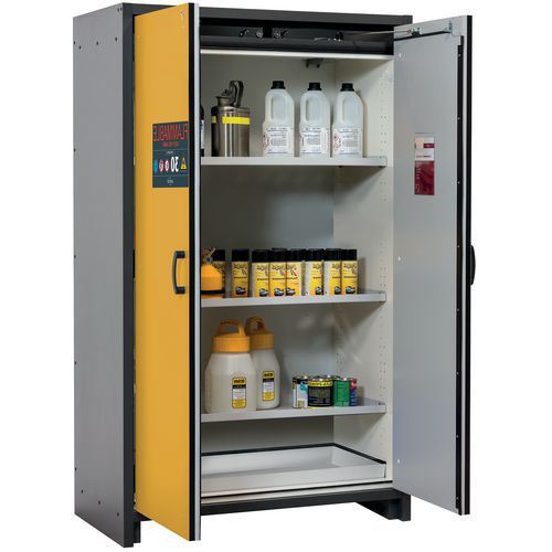Paloturvakaappi Q-CLASSIC-30. Hyväksytty syttyvien vaarallisten aineiden varastointiin työtiloissa. Toiminta - rakenne. Vankka rakenne ja pitkäikäisyys: kolminkertaisesti saranoitu ovi, kaapin runko valmistettu melamiinihartsista ja tulenkestävistä erikoislevyistä, turvaelementit kootaan varastolokeron ulkopuolella, mikä lisää suojaa syöpymiseltä, ovet metalliedustalla sekä naarmuuntumis- ja iskuvarmalla pinnalla, helppo puhdistaa. Helppo ja mukava käsitellä: ovet pysähtyvät mihin tahansa asentoonn, sulkeutuvat itsestään tulipalon sattuessa. Ei valtuuttamatonta käyttöä: ovet lukittavissa profiilisylinterilukolla (integrointi olemassa olevaan lukitusjärjestelmään mahdollista). Helppo kuljetus: integroitu kuljetusjalusta ja irrotettava, valinnainen suojus tai säädettävä tuki jalustan suojuksella. Tuuletus: integroidut ilmaputket, valmiit liitettäväksi (DN 75) tekniseen ilmanpoistojärjestelmään. Maks kuormitus (kg) : 600