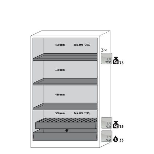 Paloturvakaappi Q-CLASSIC-90. Hyväksytty syttyvien vaarallisten aineiden varastointiin työtiloissa. Toiminta - rakenne. Vankka rakenne ja pitkäikäisyys: kolminkertaisella saranalla varustettu ovi, vankka rakenne, turvaelementit kootaan varastolokeron ulkopuolella, mikä lisää suojaa syöpymiseltä, naarmutus- ja iskunkestävä pinta, helppo puhdistaa. Kaikki yhdessä: eri osastot (moninkertainen erotus) sallii eri vaarallisten materiaalien varastoimisen yhdessä kaapissa. Helppo ja mukava käsitellä: ovet pysähtyvät mihin tahansa asentoonn, sulkeutuvat itsestään tulipalon sattuessa. Ei valtuuttamatonta käyttöä: ovet lukittavissa sylinterilukolla (integrointi olemassa olevaan lukitusjärjestelmään mahdollista), lukitustilan merkkivalo (punainen-vihreä). Helppo kuljetus: integroitu kuljetusjalusta ja irrotettava, valinnainen jalustan suojus. Helppo tasaus: säätöjalat lattian epätasaisuuden kompensoimiseksi. Tuuletus: integroidut ilmaputket, valmiit liitettäväksi (DN 75) tekniseen ilmanpoistojärjestelmään, syöksykierteet pakoristikossa riittävän teknisen tuuletuksen merkkinä. Valmistettu Saksassa Maks kuormitus (kg) : 600 kg