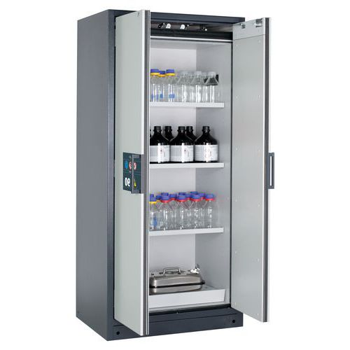 Paloturvakaappi Q-CLASSIC-90. Hyväksytty syttyvien vaarallisten aineiden varastointiin työtiloissa. Toiminta - rakenne. Vankka rakenne ja pitkäikäisyys: kolminkertaisella saranalla varustettu ovi, vankka rakenne, turvaelementit kootaan varastolokeron ulkopuolella, mikä lisää suojaa syöpymiseltä, naarmutus- ja iskunkestävä pinta, helppo puhdistaa. Helppo ja mukava käsitellä: ovet pysähtyvät mihin tahansa asentoonn, sulkeutuvat itsestään tulipalon sattuessa. Ei valtuuttamatonta käyttöä: ovet lukittavissa sylinterilukolla (integrointi olemassa olevaan lukitusjärjestelmään mahdollista), lukitustilan merkkivalo (punainen-vihreä). Helppo kuljetus: integroitu kuljetusjalusta ja irrotettava, valinnainen jalustan suojus. Helppo tasaus: säätöjalat lattian epätasaisuuden kompensoimiseksi. Tuuletus: integroidut ilmaputket, valmiit liitettäväksi (DN 75) tekniseen ilmanpoistojärjestelmään, syöksykierteet pakoristikossa riittävän teknisen tuuletuksen merkkinä.