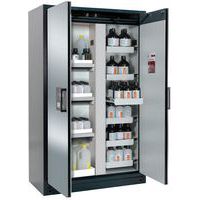 Paloturvakaappi Q-CLASSIC-90. Hyväksytty syttyvien vaarallisten aineiden varastointiin työtiloissa. Toiminta - rakenne. Vankka rakenne ja pitkäikäisyys: kolminkertaisella saranalla varustettu ovi, vankka rakenne, turvaelementit kootaan varastolokeron ulkopuolella, mikä lisää suojaa syöpymiseltä, naarmutus- ja iskunkestävä pinta, helppo puhdistaa. Kaikki yhdessä: eri osastot (moninkertainen erotus) sallii eri vaarallisten materiaalien varastoimisen yhdessä kaapissa. Helppo ja mukava käsitellä: ovet pysähtyvät mihin tahansa asentoonn, sulkeutuvat itsestään tulipalon sattuessa. Ei valtuuttamatonta käyttöä: ovet lukittavissa sylinterilukolla (integrointi olemassa olevaan lukitusjärjestelmään mahdollista), lukitustilan merkkivalo (punainen-vihreä). Helppo kuljetus: integroitu kuljetusjalusta ja irrotettava, valinnainen jalustan suojus. Helppo tasaus: säätöjalat lattian epätasaisuuden kompensoimiseksi. Tuuletus: integroidut ilmaputket, valmiit liitettäväksi (DN 75) tekniseen ilmanpoistojärjestelmään, syöksykierteet pakoristikossa riittävän teknisen tuuletuksen merkkinä. Valmistettu Saksassa Maks kuormitus (kg) : 600