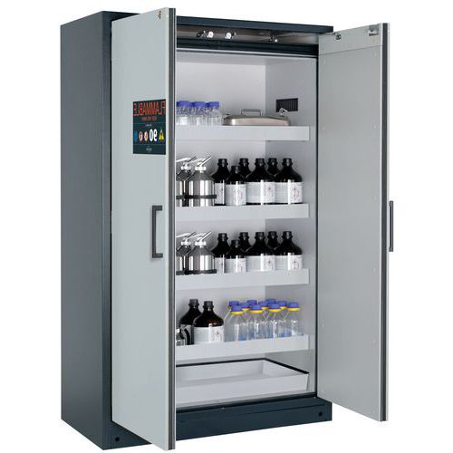Paloturvakaappi Q-CLASSIC-90. Hyväksytty syttyvien vaarallisten aineiden varastointiin työtiloissa. Toiminta - rakenne. Vankka rakenne ja pitkäikäisyys: kolminkertaisella saranalla varustettu ovi, vankka rakenne, turvaelementit kootaan varastolokeron ulkopuolella, mikä lisää suojaa syöpymiseltä, naarmutus- ja iskunkestävä pinta, helppo puhdistaa. Kaksi yhdessä: 2 osastoa (pystysuunnassa erotettu) mahdollistaa palavien nesteiden ja aggressiivisten kemikaalien varastoinnin samassa kaapissa. Helppo ja mukava käsitellä: ovet pysähtyvät mihin tahansa asentoonn, sulkeutuvat itsestään tulipalon sattuessa. Ei valtuuttamatonta käyttöä: ovet lukittavissa sylinterilukolla (integrointi olemassa olevaan lukitusjärjestelmään mahdollista), lukitustilan merkkivalo (punainen-vihreä). Helppo kuljetus: integroitu kuljetusjalusta ja irrotettava, valinnainen jalustan suojus. Helppo tasaus: säätöjalat lattian epätasaisuuden kompensoimiseksi. Tuuletus: integroidut ilmaputket, valmiit liitettäväksi (DN 75) tekniseen ilmanpoistojärjestelmään, syöksykierteet pakoristikossa riittävän teknisen tuuletuksen merkkinä.