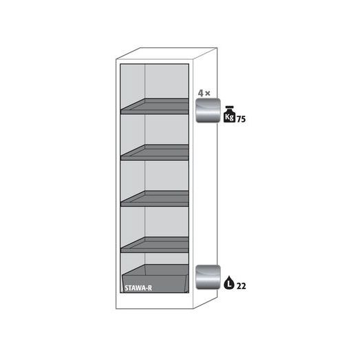 Paloturvakaappi Q-PEGASUS-90. Hyväksytty syttyvien vaarallisten aineiden varastointiin työtiloissa. Toiminta - rakenne. Vankka rakenne ja pitkäikäisyys: kolminkertaisella saranalla varustettu ovi, vankka rakenne, turvaelementit kootaan varastolokeron ulkopuolella, mikä lisää suojaa syöpymiseltä, naarmutus- ja iskunkestävä pinta, helppo puhdistaa. Käyttäjäystävällinen ja turvallinen: avoimen oven pysäytysjärjestelmä (vakio) mahdollistaa kätevän ja turvallisen astioiden ottamisen tai kaappiin laittamisen. Aina suljettu: sarja-automaattinen ovien sulkeutuminen (TSA) vapauttaa pysäytetyn oven n. 60 sekunnin jälkeen, akustinen ja visuaalinen signaali ennen sulkemista. Ei valtuuttamatonta käyttöä: ovi lukittavissa sylinterilukolla (integrointi olemassa olevaan lukitusjärjestelmään mahdollista), lukitustilan merkkivalo (punainen-vihreä). Helppo kuljetus: integroitu kuljetusjalusta ja irrotettava, valinnainen jalustan suojus. Helppo tasaus: säätöjalat lattian epätasaisuuden kompensoimiseksi. Tuuletus: integroidut ilmaputket, valmiit liitettäväksi (DN 75) tekniseen ilmanpoistojärjestelmään, syöksykierteet pakoristikossa riittävän teknisen tuuletuksen merkkinä. Valmistettu Saksassa Maks kuormitus (kg) : 600 kg