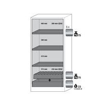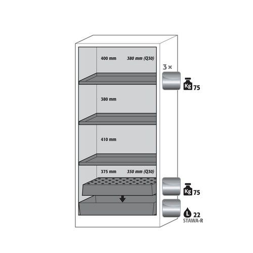 Paloturvakaappi Q-PEGASUS-90. Hyväksytty syttyvien vaarallisten aineiden varastointiin työtiloissa. Toiminta - rakenne. Vankka rakenne ja pitkäikäisyys: kolminkertaisella saranalla varustettu ovi, vankka rakenne, turvaelementit kootaan varastolokeron ulkopuolella, mikä lisää suojaa syöpymiseltä, naarmutus- ja iskunkestävä pinta, helppo puhdistaa. Vaivaton käyttö: yhden käden käytettävyys kaksiovisissa kaapeissa (AGT). Käyttäjäystävällinen ja turvallinen: avoimen oven pysäytysjärjestelmä (vakio) mahdollistaa kätevän ja turvallisen astioiden ottamisen tai kaappiin laittamisen. Aina suljettu: sarja-automaattinen ovien sulkeutuminen (TSA) vapauttaa pysäytetyt ovet n. 60 sekunnin jälkeen, akustinen ja visuaalinen signaali ennen sulkemista. Ei valtuuttamatonta käyttöä: ovet lukittavissa sylinterilukolla (integrointi olemassa olevaan lukitusjärjestelmään mahdollista), lukitustilan merkkivalo (punainen-vihreä). Helppo kuljetus: integroitu kuljetusjalusta ja irrotettava, valinnainen jalustan suojus. Helppo tasaus: säätöjalat lattian epätasaisuuden kompensoimiseksi. Tuuletus: integroidut ilmaputket, valmiit liitettäväksi (DN 75) tekniseen ilmanpoistojärjestelmään, syöksykierteet pakoristikossa riittävän teknisen tuuletuksen merkkinä. Valmistettu Saksassa Maks kuormitus (kg) : 600 kg