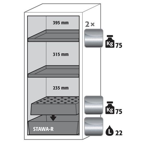 Paloturvakaappi S-CLASSIC-90. Hyväksytty syttyvien vaarallisten aineiden varastointiin työtiloissa. Toiminta - rakenne. Vankka rakenne ja pitkäikäisyys: kolmisaranaisnen ovi, runko valmistettu pulveripäällyksisestä teräslevystä, turvaelementit kootaan kaapin ulkopuolella, mikä lisää suojaa syöpymiseltä, helppo puhdistaa. Ei valtuuttamatonta käyttöä: ovi lukittavissa profiilisylinterilukolla (integrointi olemassa olevaan lukitusjärjestelmään mahdollista). Helppo tasaus: säätöjalat lattian epätasaisuuden kompensoimiseksi. Tuuletus: integroidut ilmaputket, valmiit liitettäväksi (DN 75) tekniseen ilmanpoistojärjestelmään. Valmistettu Saksassa Maks kuormitus (kg) : 600 kg