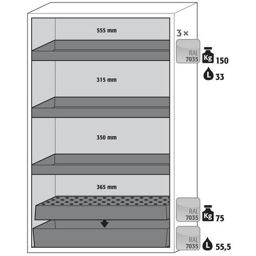 Paloturvakaappi S-CLASSIC-90. Hyväksytty syttyvien vaarallisten aineiden varastointiin työtiloissa. Toiminta - rakenne. Vankka rakenne ja pitkäikäisyys: kolmisaranaisnen ovi, runko valmistettu pulveripäällyksisestä teräslevystä, turvaelementit kootaan kaapin ulkopuolella, mikä lisää suojaa syöpymiseltä, helppo puhdistaa. Ei valtuuttamatonta käyttöä: ovet lukittavissa profiilisylinterilukolla (integrointi olemassa olevaan lukitusjärjestelmään mahdollista). Helppo tasaus: säätöjalat lattian epätasaisuuden kompensoimiseksi. Tuuletus: integroidut ilmaputket, valmiit liitettäväksi (DN 75) tekniseen ilmanpoistojärjestelmään. Valmistettu Saksassa