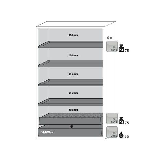 Paloturvakaappi S-CLASSIC-90. Hyväksytty syttyvien vaarallisten aineiden varastointiin työtiloissa. Toiminta - rakenne. Vankka rakenne ja pitkäikäisyys: kolmisaranaisnen ovi, runko valmistettu pulveripäällyksisestä teräslevystä, turvaelementit kootaan kaapin ulkopuolella, mikä lisää suojaa syöpymiseltä, helppo puhdistaa. Kaksi yhdessä: 2 osastoa (pystysuunnassa erotettu) mahdollistaa palavien nesteiden ja aggressiivisten kemikaalien varastoinnin samassa kaapissa. Käyttäjäystävällinen ja turvallinen: avoimen oven pysäytysjärjestelmä (vakio) mahdollistaa kätevän ja turvallisen astioiden ottamisen tai kaappiin laittamisen. Ei valtuuttamatonta käyttöä: ovet lukittavissa profiilisylinterilukolla (integrointi olemassa olevaan lukitusjärjestelmään mahdollista). Helppo tasaus: säätöjalat lattian epätasaisuuden kompensoimiseksi. Tuuletus: integroidut ilmaputket, valmiit liitettäväksi (DN 75) tekniseen ilmanpoistojärjestelmään. Valmistettu Saksassa Maks kuormitus (kg) : 600 kg Takuu (vuosia) : 5 vuotta