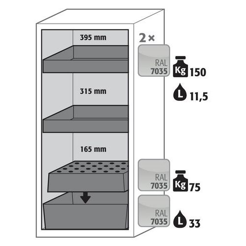 Paloturvakaappi S-CLASSIC-90. Hyväksytty syttyvien vaarallisten aineiden varastointiin työtiloissa. Toiminta - rakenne. Vankka rakenne ja pitkäikäisyys: kolmisaranaisnen ovi, runko valmistettu pulveripäällyksisestä teräslevystä, turvaelementit kootaan kaapin ulkopuolella, mikä lisää suojaa syöpymiseltä, helppo puhdistaa. Kaksi yhdessä: 2 lokeroa (vaakasuoraan erotettuna) sallivat syttyvien nesteiden ja aggressiivisten kemikaalien varastointi samassa kaapissa. Käyttäjäystävällinen ja turvallinen: avoimen oven pysäytysjärjestelmä (vakio) mahdollistaa kätevän ja turvallisen astioiden ottamisen tai kaappiin laittamisen. Ei valtuuttamatonta käyttöä: ovi lukittavissa profiilisylinterilukolla (integrointi olemassa olevaan lukitusjärjestelmään mahdollista). Helppo tasaus: säätöjalat lattian epätasaisuuden kompensoimiseksi. Tuuletus: integroidut ilmaputket, valmiit liitettäväksi (DN 75) tekniseen ilmanpoistojärjestelmään. Valmistettu Saksassa Maks kuormitus (kg) : 600 kg