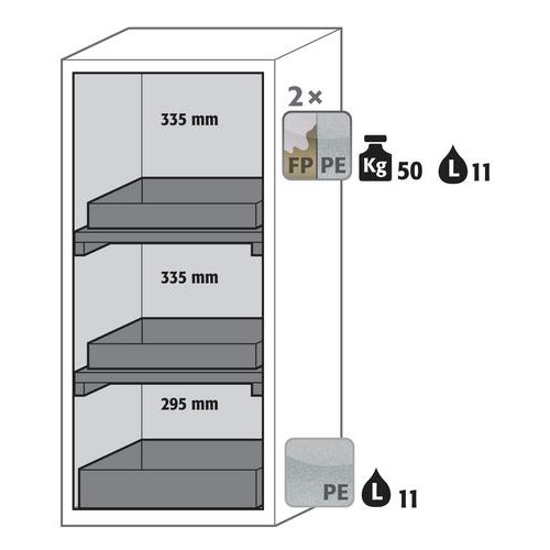 Paloturvakaappi S-CLASSIC-90. Hyväksytty syttyvien vaarallisten aineiden varastointiin työtiloissa. Toiminta - rakenne. Vankka rakenne ja pitkäikäisyys: kolmisaranaisnen ovi, runko valmistettu pulveripäällyksisestä teräslevystä, turvaelementit kootaan kaapin ulkopuolella, mikä lisää suojaa syöpymiseltä, helppo puhdistaa. Ei valtuuttamatonta käyttöä: ovi lukittavissa profiilisylinterilukolla (integrointi olemassa olevaan lukitusjärjestelmään mahdollista). Helppo tasaus: säätöjalat lattian epätasaisuuden kompensoimiseksi. Tuuletus: integroidut ilmaputket, valmiit liitettäväksi (DN 75) tekniseen ilmanpoistojärjestelmään. Valmistettu Saksassa Maks kuormitus (kg) : 600 kg