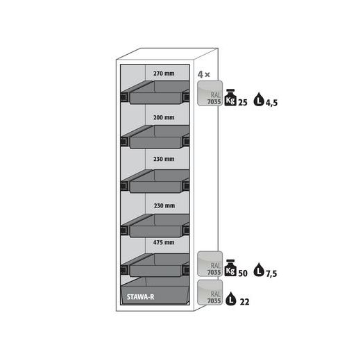 Paloturvakaappi S-CLASSIC-90. Hyväksytty syttyvien vaarallisten aineiden varastointiin työtiloissa. Toiminta - rakenne. Vankka rakenne ja pitkäikäisyys: kolmisaranaisnen ovi, runko valmistettu pulveripäällyksisestä teräslevystä, turvaelementit kootaan kaapin ulkopuolella, mikä lisää suojaa syöpymiseltä, helppo puhdistaa. Kaksi yhdessä: 2 lokeroa (vaakasuoraan erotettuna) sallivat syttyvien nesteiden ja aggressiivisten kemikaalien varastointi samassa kaapissa. Käyttäjäystävällinen ja turvallinen: avoimen oven pysäytysjärjestelmä (vakio) mahdollistaa kätevän ja turvallisen astioiden ottamisen tai kaappiin laittamisen. Ei valtuuttamatonta käyttöä: ovi lukittavissa profiilisylinterilukolla (integrointi olemassa olevaan lukitusjärjestelmään mahdollista). Helppo tasaus: säätöjalat lattian epätasaisuuden kompensoimiseksi. Tuuletus: integroidut ilmaputket, valmiit liitettäväksi (DN 75) tekniseen ilmanpoistojärjestelmään. Valmistettu Saksassa Maks kuormitus (kg) : 600 kg