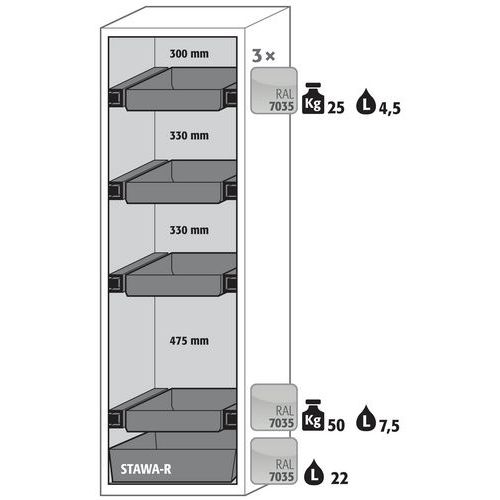 Paloturvakaappi S-CLASSIC-90. Hyväksytty syttyvien vaarallisten aineiden varastointiin työtiloissa. Toiminta - rakenne. Vankka rakenne ja pitkäikäisyys: kolmisaranaisnen ovi, runko valmistettu pulveripäällyksisestä teräslevystä, turvaelementit kootaan kaapin ulkopuolella, mikä lisää suojaa syöpymiseltä, helppo puhdistaa. Käyttäjäystävällinen ja turvallinen (malli. WDAS): avoimen oven pysäytysjärjestelmä, mahdollistaa kätevän ja turvallisen astioiden ottamisen tai kaappiin laittamisen. Ei valtuuttamatonta käyttöä: ovi lukittavissa profiilisylinterilukolla (integrointi olemassa olevaan lukitusjärjestelmään mahdollista). Helppo tasaus: säätöjalat lattian epätasaisuuden kompensoimiseksi. Tuuletus: integroidut ilmaputket, valmiit liitettäväksi (DN 75) tekniseen ilmanpoistojärjestelmään. Valmistettu Saksassa