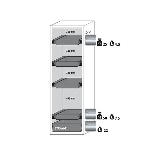 Paloturvakaappi S-CLASSIC-90. Hyväksytty syttyvien vaarallisten aineiden varastointiin työtiloissa. Toiminta - rakenne. Vankka rakenne ja pitkäikäisyys: kolmisaranaisnen ovi, runko valmistettu pulveripäällyksisestä teräslevystä, turvaelementit kootaan kaapin ulkopuolella, mikä lisää suojaa syöpymiseltä, helppo puhdistaa. Käyttäjäystävällinen ja turvallinen (malli. WDAS): avoimen oven pysäytysjärjestelmä, mahdollistaa kätevän ja turvallisen astioiden ottamisen tai kaappiin laittamisen. Ei valtuuttamatonta käyttöä: ovi lukittavissa profiilisylinterilukolla (integrointi olemassa olevaan lukitusjärjestelmään mahdollista). Helppo tasaus: säätöjalat lattian epätasaisuuden kompensoimiseksi. Tuuletus: integroidut ilmaputket, valmiit liitettäväksi (DN 75) tekniseen ilmanpoistojärjestelmään. Valmistettu Saksassa