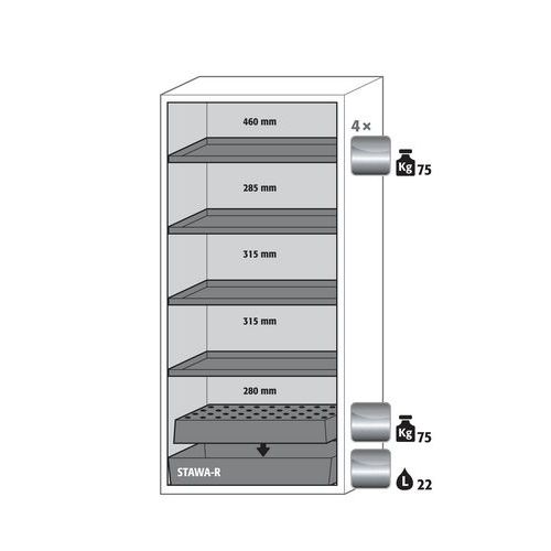 Paloturvakaappi S-CLASSIC-90. Hyväksytty syttyvien vaarallisten aineiden varastointiin työtiloissa. Toiminta - rakenne: Vankka rakenne ja pitkäikäisyys: kolmisaranaisnen ovi, runko valmistettu pulveripäällyksisestä teräslevystä, turvaelementit kootaan kaapin ulkopuolella, mikä lisää suojaa syöpymiseltä, helppo puhdistaa. Ei valtuuttamatonta käyttöä: ovet lukittavissa profiilisylinterilukolla (integrointi olemassa olevaan lukitusjärjestelmään mahdollista). Helppo tasaus: säätöjalat lattian epätasaisuuden kompensoimiseksi. Tuuletus: integroidut ilmaputket, valmiit liitettäväksi (DN 75) tekniseen ilmanpoistojärjestelmään. Valmistettu Saksassa