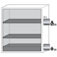 Paloturvakaappi S-CLASSIC-90. Hyväksytty syttyvien vaarallisten aineiden varastointiin työtiloissa. Toiminta - rakenne: Vankka rakenne ja pitkäikäisyys: kolmisaranaisnen ovi, runko valmistettu pulveripäällyksisestä teräslevystä, turvaelementit kootaan kaapin ulkopuolella, mikä lisää suojaa syöpymiseltä, helppo puhdistaa. Ei valtuuttamatonta käyttöä: ovet lukittavissa profiilisylinterilukolla (integrointi olemassa olevaan lukitusjärjestelmään mahdollista). Helppo tasaus: säätöjalat lattian epätasaisuuden kompensoimiseksi. Tuuletus: integroidut ilmaputket, valmiit liitettäväksi (DN 75) tekniseen ilmanpoistojärjestelmään. Valmistettu Saksassa Takuu (vuosia) : 5 vuotta Maks kuormitus (kg) : 600