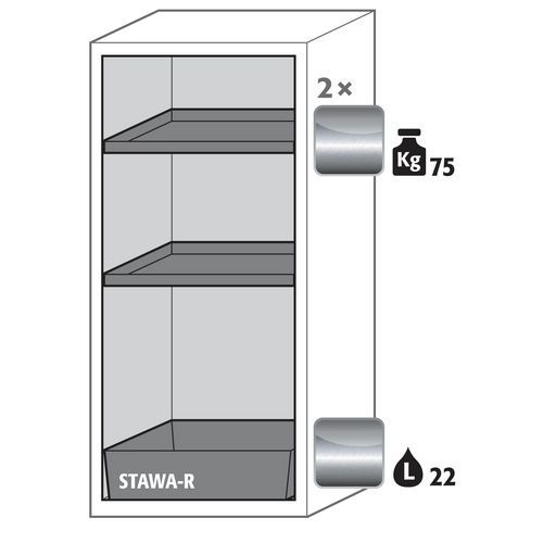Paloturvakaappi S-PEGASUS-90. Hyväksytty syttyvien vaarallisten aineiden varastointiin työtiloissa. Toiminta - rakenne. Vankka rakenne ja pitkäikäisyys: kolmisaranaisnen ovi, runko valmistettu pulveripäällyksisestä teräslevystä, turvaelementit kootaan kaapin ulkopuolella, mikä lisää suojaa syöpymiseltä, helppo puhdistaa. Käyttäjäystävällinen ja turvallinen: avoimen oven pysäytysjärjestelmä (vakio) mahdollistaa kätevän ja turvallisen astioiden ottamisen tai kaappiin laittamisen. Aina suljettu: sarja-automaattinen ovien sulkeutuminen (TSA) vapauttaa pysäytetyn oven n. 60 sekunnin jälkeen, akustinen ja visuaalinen signaali ennen sulkemista. Ei valtuuttamatonta käyttöä: ovi lukittavissa profiilisylinterilukolla (integrointi olemassa olevaan lukitusjärjestelmään mahdollista). Helppo tasaus: säätöjalat lattian epätasaisuuden kompensoimiseksi. Tuuletus: integroidut ilmaputket, valmiit liitettäväksi (DN 75) tekniseen ilmanpoistojärjestelmään. Valmistettu Saksassa Maks kuormitus (kg) : 600 kg