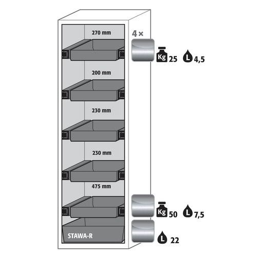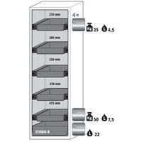 Paloturvakaappi S-PHOENIX Vol.2-90. Hyväksytty syttyvien vaarallisten aineiden varastointiin työtiloissa. Toiminta - rakenne: Vankka rakenne ja pitkäikäisyys: kolmisaranaisnen ovi, runko valmistettu pulveripäällyksisestä teräslevystä, turvaelementit kootaan kaapin ulkopuolella, mikä lisää suojaa syöpymiseltä, helppo puhdistaa. Tilaa säästävä haitariovi: tarvitsevat vähemmän tilaa kaapin etupuolella kaapin oven ollessa auki. Käyttäjäystävällinen ja turvallinen: avoimen oven pysäytysjärjestelmä (vakio) mahdollistaa kätevän ja turvallisen astioiden ottamisen tai kaappiin laittamisen. Aina suljettu: sarja-automaattinen ovien sulkeutuminen (TSA) vapauttaa pysäytetyn oven n. 60 sekunnin jälkeen, akustinen ja visuaalinen signaali ennen sulkemista. Ei valtuuttamatonta käyttöä: ovi lukittavissa profiilisylinterilukolla (integrointi olemassa olevaan lukitusjärjestelmään mahdollista). Helppo tasaus: säätöjalat lattian epätasaisuuden kompensoimiseksi. Tuuletus: integroidut ilmaputket, valmiit liitettäväksi (DN 75) tekniseen ilmanpoistojärjestelmään. Valmistettu Saksassa Maks kuormitus (kg) : 600 kg