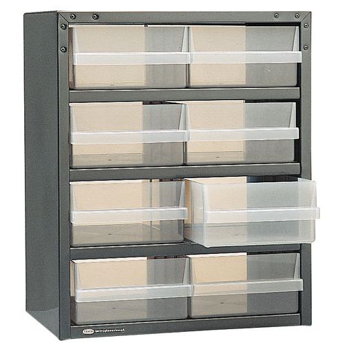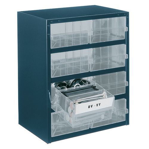 | Tavaranimike | Pienten osien säilytyskaappi 250-sarja, Materiaali: Teräs, Kokonaiskorkeus: 435 mm, Kokonaisleveys: 360 mm |