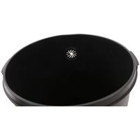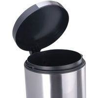 Pyöreä roskakori, jossa muovikansi ja poljin ruostumattomasta teräksestä.  Muovivuori ja hiljainen sulkeminen.
