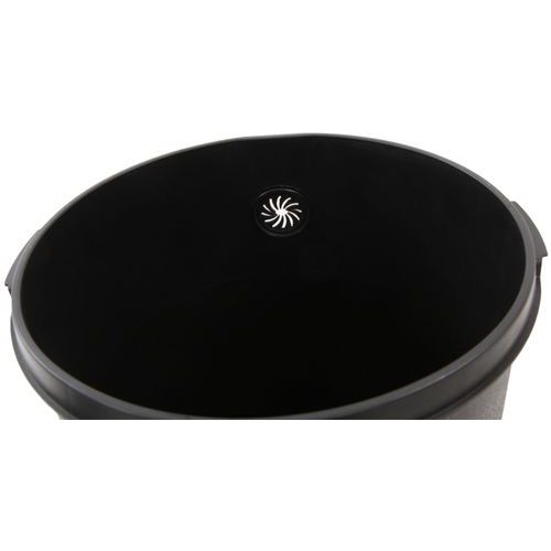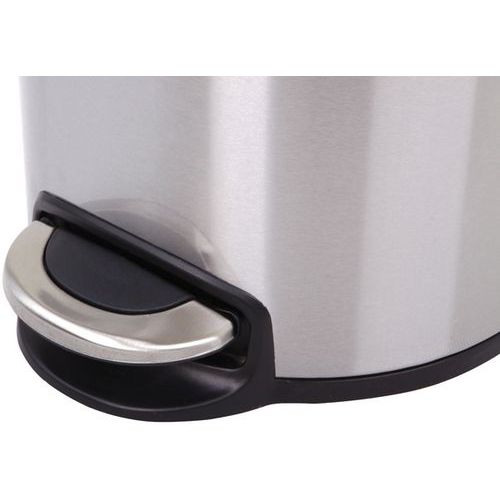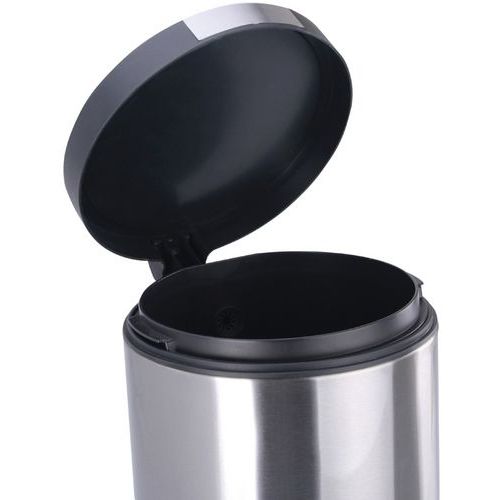 Pyöreä roskakori, jossa muovikansi ja poljin ruostumattomasta teräksestä. Muovivuori ja hiljainen sulkeminen.