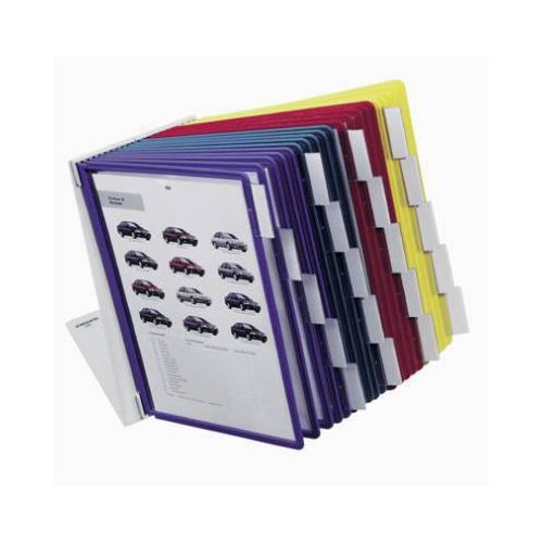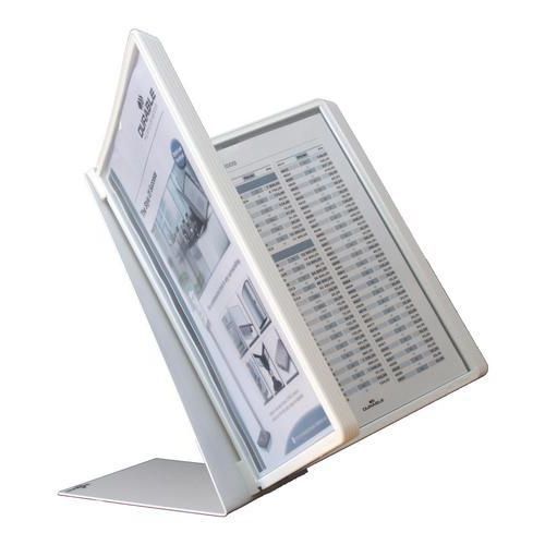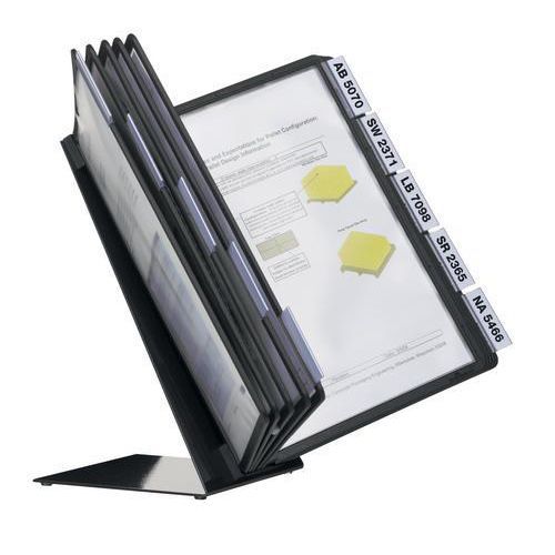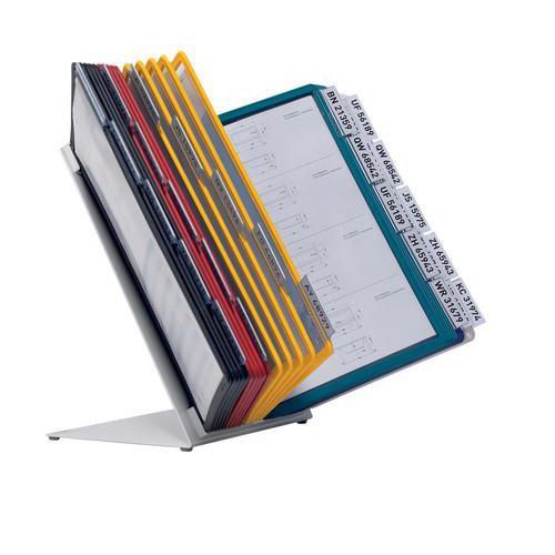 Kestävä pöytäteline valkoisesta, harmaasta tai mustasta lakatusta metallista. Polypropeenipaneelit värillisillä taskuilla, joissa on vähän heijastava ja skannauksenkestävä muovi. Sisältää otsakepitimet, joissa on tyhjät nimikortit merkintää varten. Vankka pöytäteline jauhemaalatusta teräslevystä, erittäin vakaa L-muodon ansiosta. Käytännöllinen kääntömekanismi taskujen helppoon vaihtamiseen. 5 vuoden takuu.